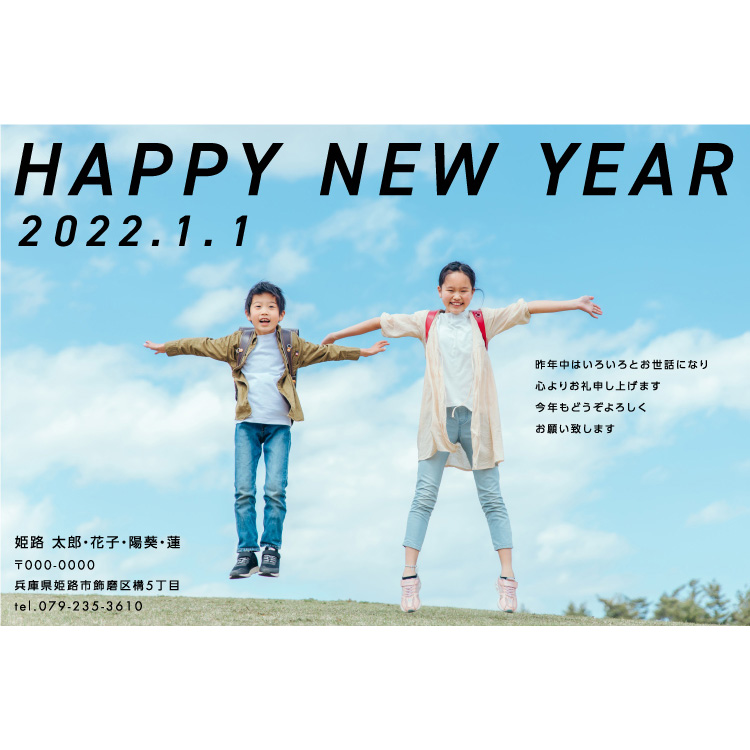 写真1枚を大きく使用し、ポスターのような洗練された印象のデザインです。写真の雰囲気を重視したダントツの一番人気デザインタイプ。デザインの自由度が高くいろんな魅せ方のできるデザインタイプです。