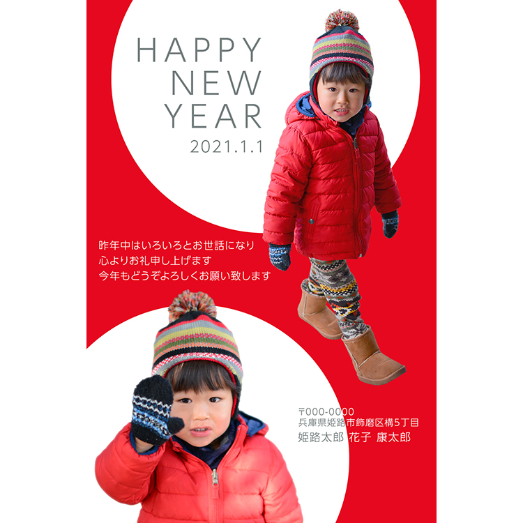 キリヌキ写真2枚を大胆に配置するインパクトのある個性的なデザインです。特に動きのあるポーズの写真を選ぶとおもしろい印象になります。写真を選ぶ際は“全身が写っているもの”がオススメです。