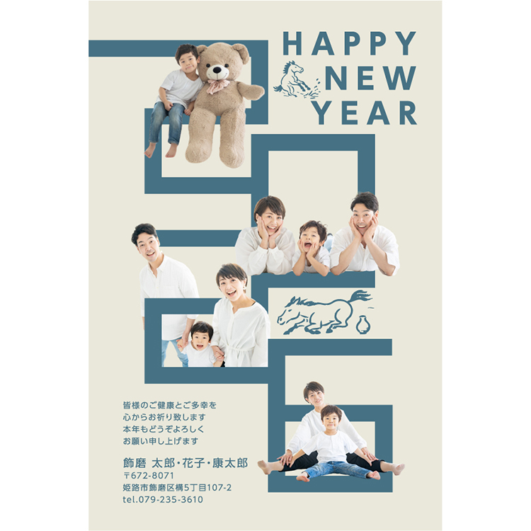 例えば写真4枚使用の年賀状なら、顔のアップが2枚、少し遠くからの写真、プラス風景やイメージ写真を組み合わせると素敵なポストカードに変身。サンプルを参考にしてくださいね。